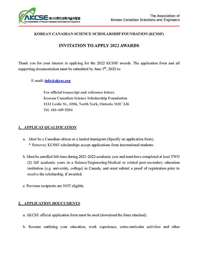 Korean Canadian Science Scholarship Foundation Kcssf Invitation To Apply 2022 Awards